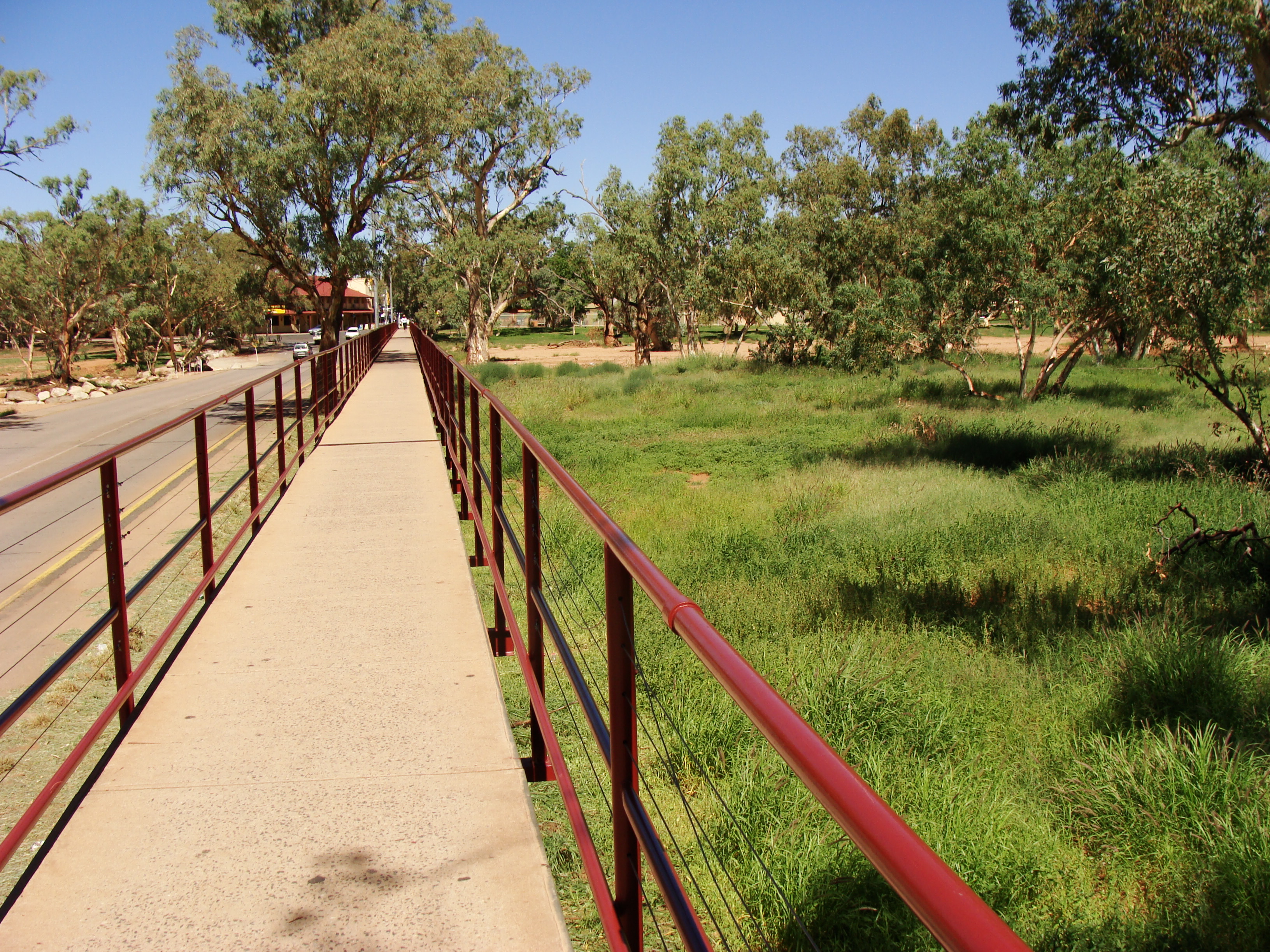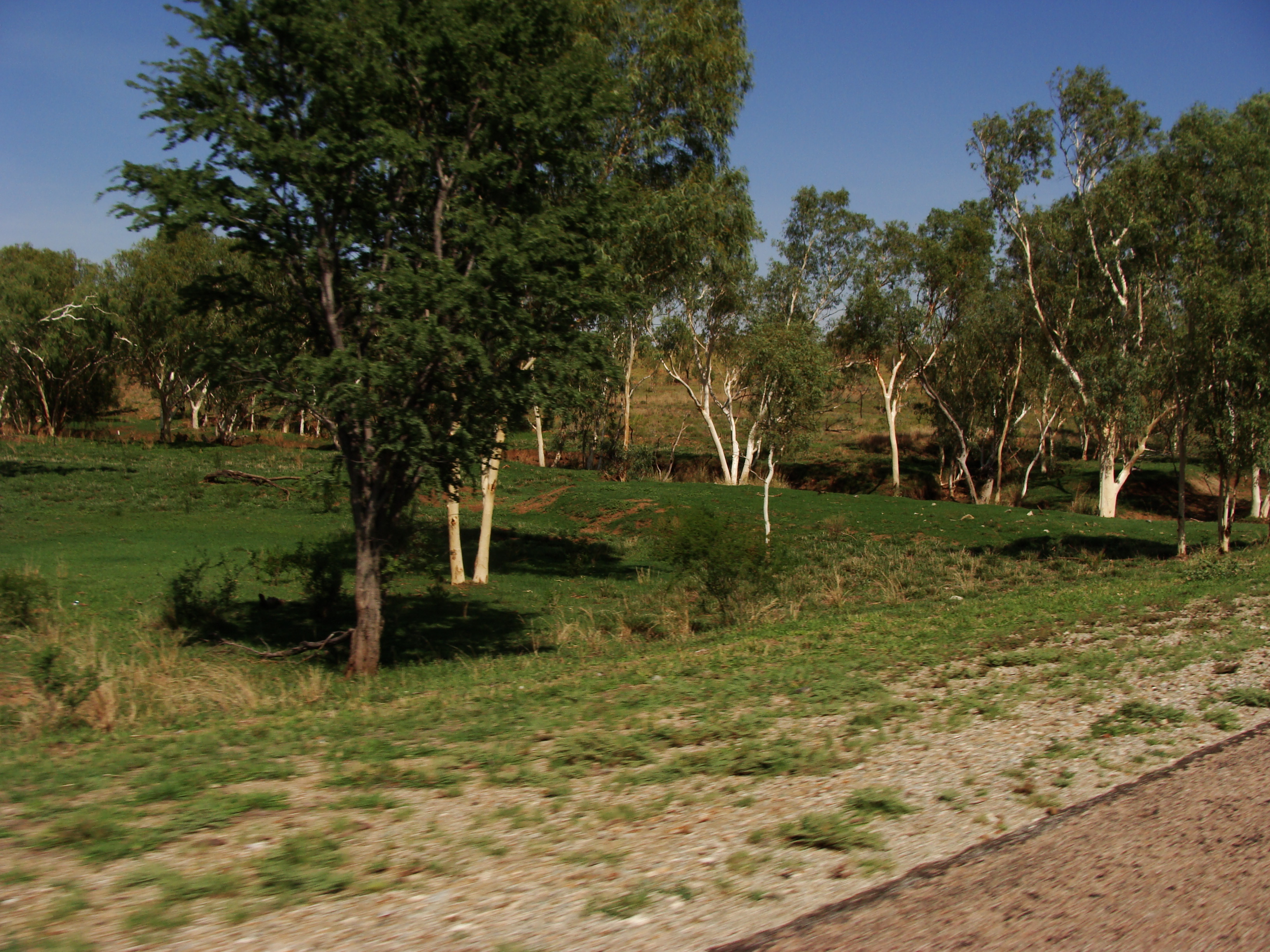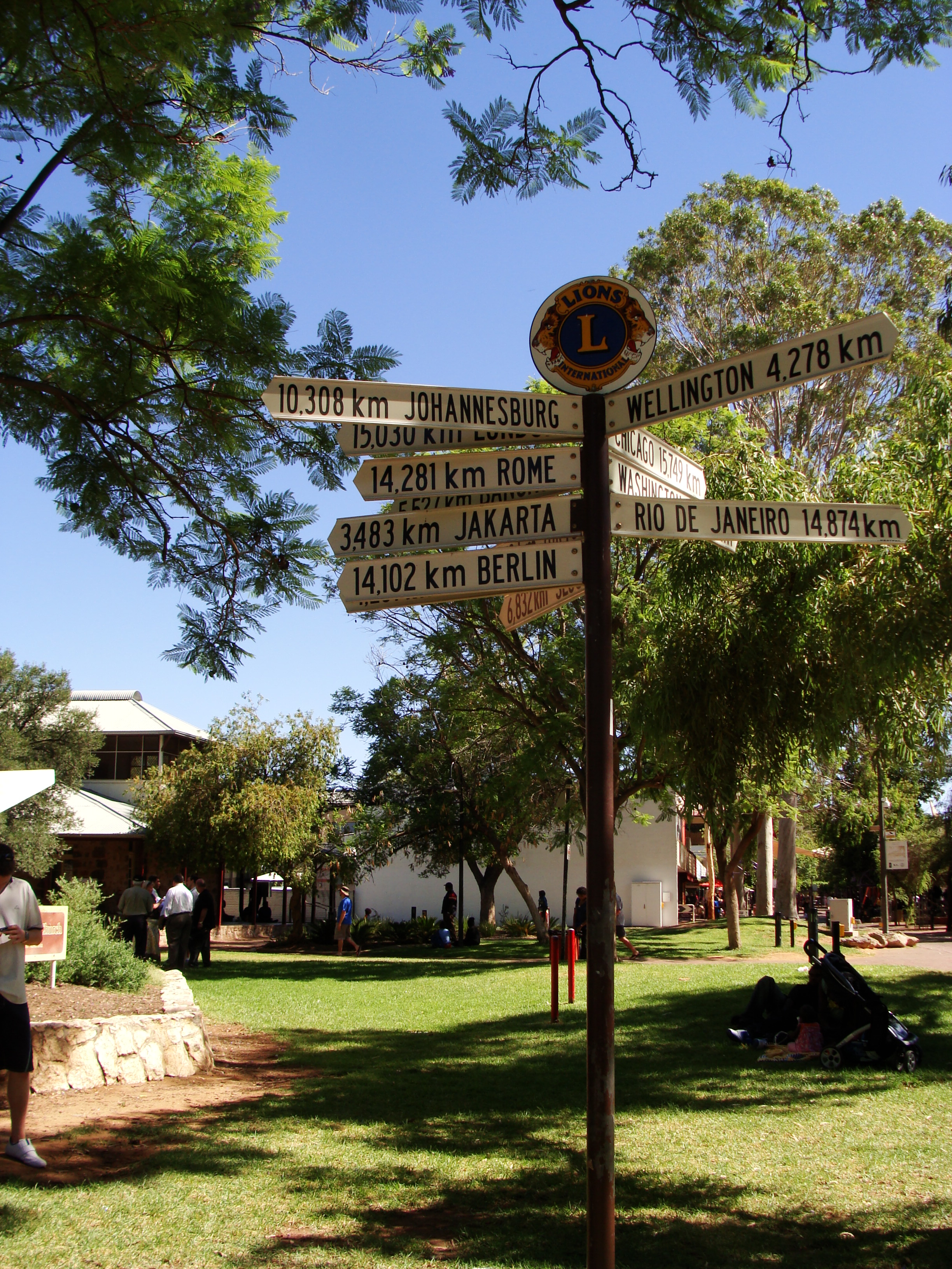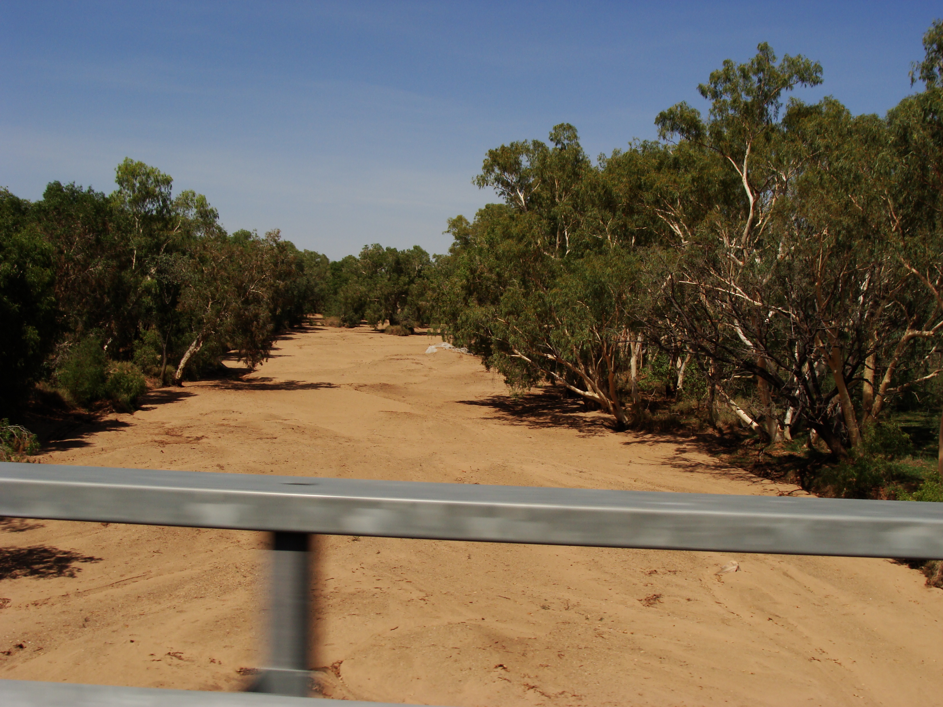 Einige Flüsse in Australien führen sogar Wasser…… es regnet nämlich.Die Holzklasse. Gold- und Platinum-Service konnten wir nicht sehen und natürlich auch nicht leisten. Selbst das Bett war viel zu teuer…Sonnenaufgang aus dem fahrenden Zug fotografiert…Man könne meinen, der Bush brennt…oder?Aber es ist doch nur die Sonne!Wieso ist Berlin näher dran an Alice Springs als Rom?Ha, erwischt! In Australien wird der Schlitten vom Weihnachtsmann von Albino-Känguruhs gezogen.Der Todd River in Alice Springs. Führt ganz selten mal Wasser, daher wird die alljährliche Regatta auch mit den Händen durchgeführt.
