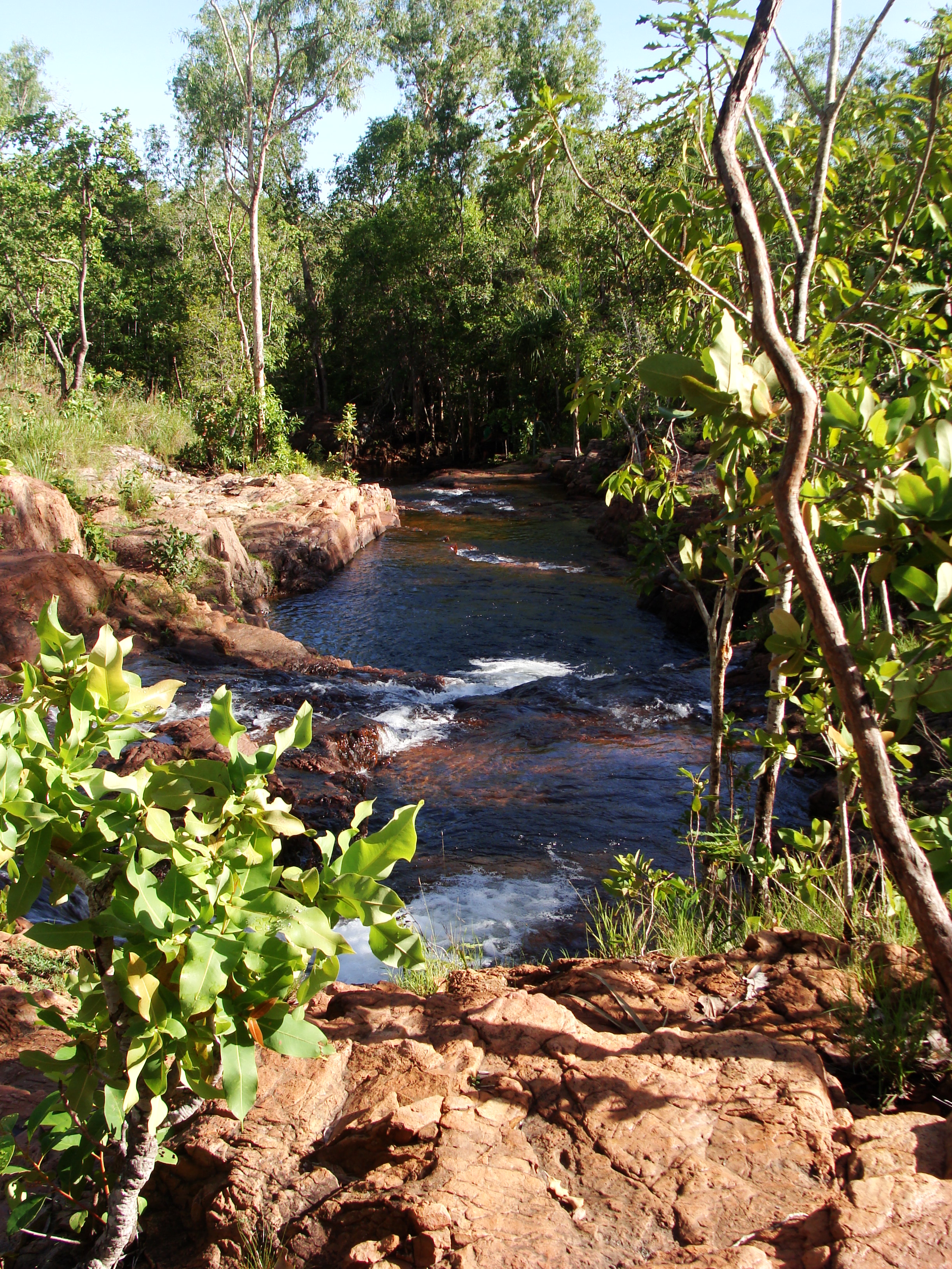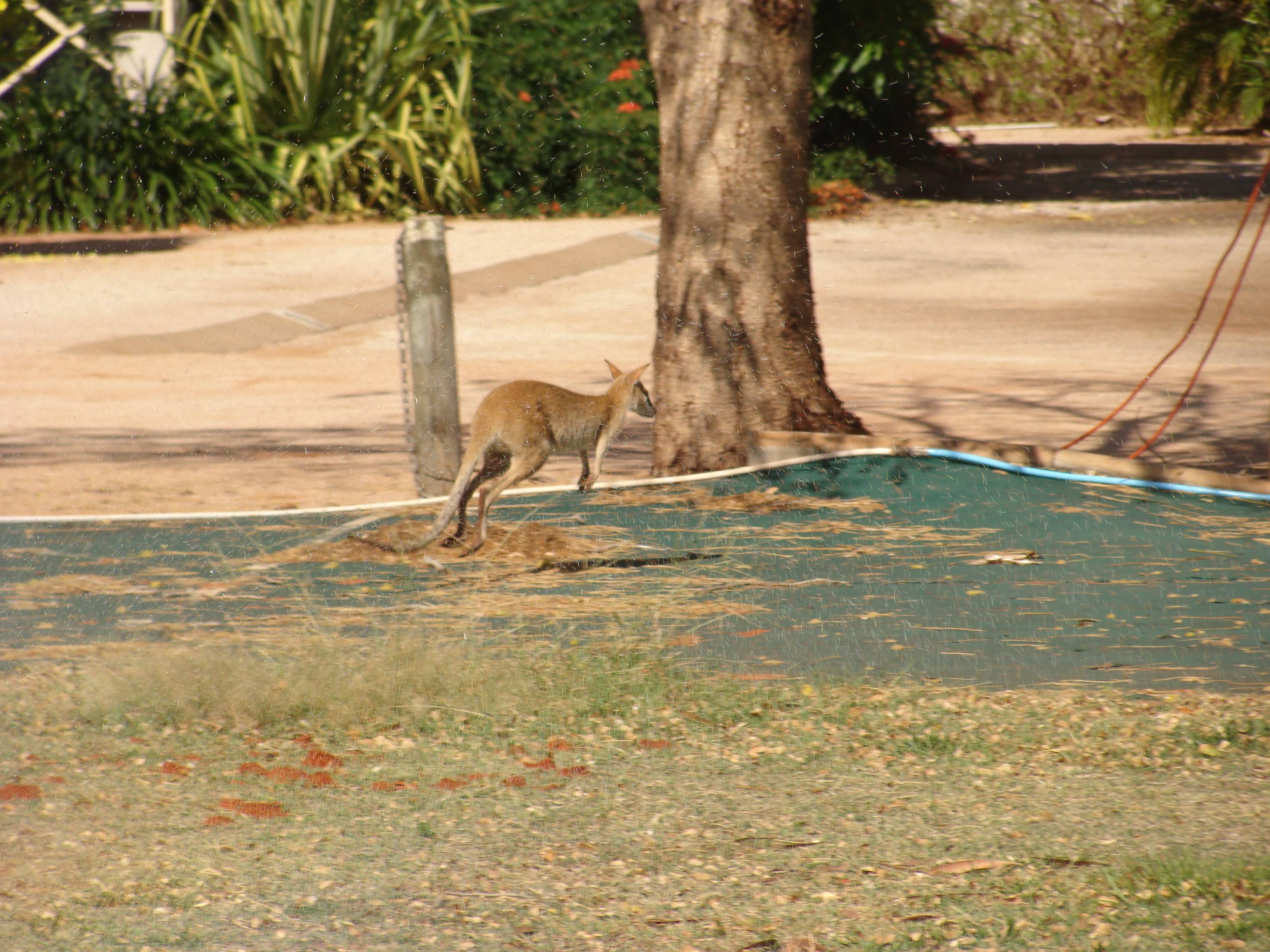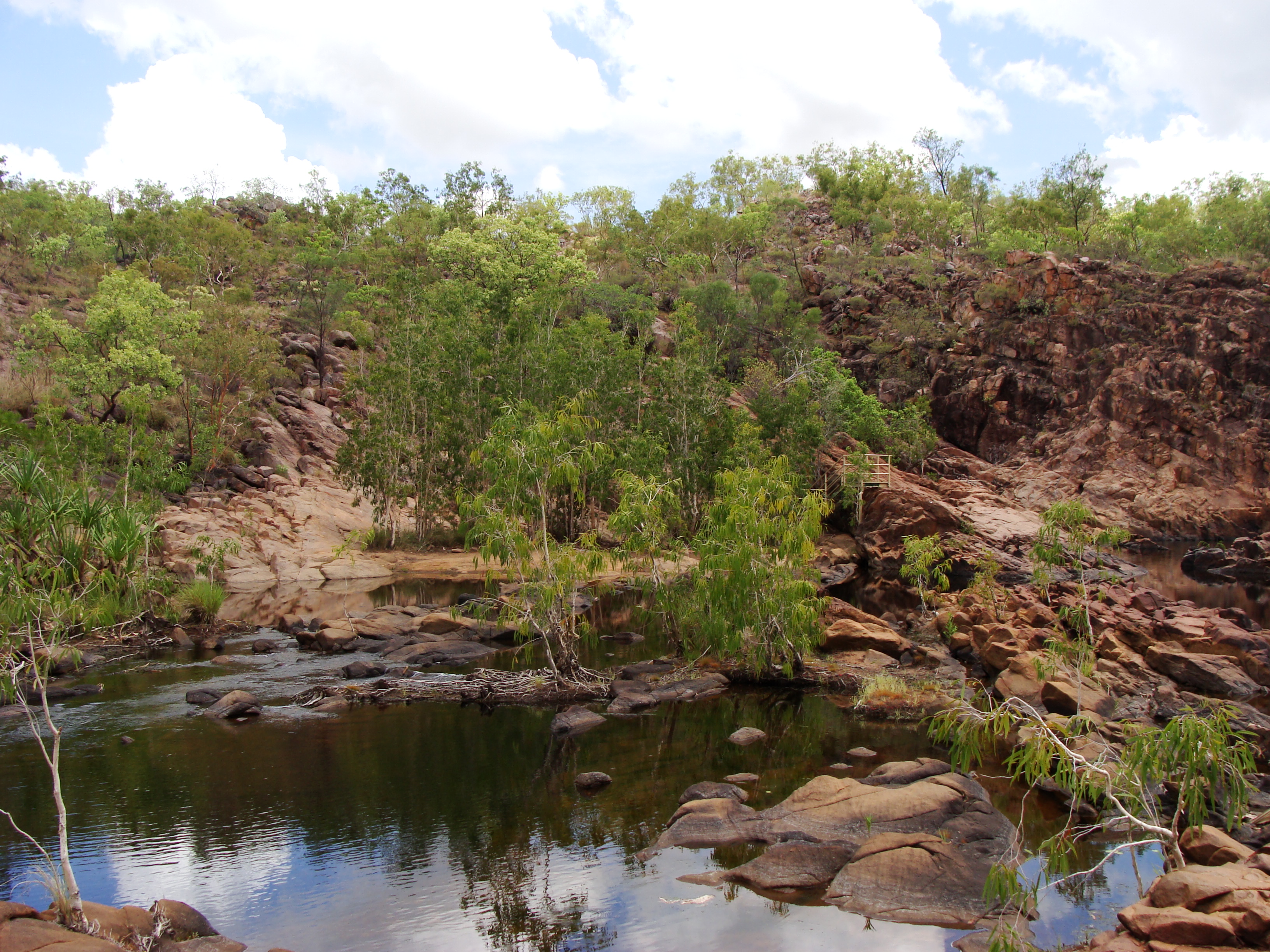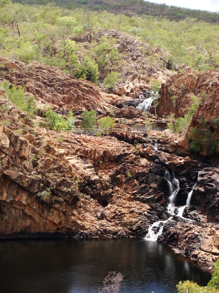 Es ging dann in drei Tagen bis nach Katherine, der nächsten größeren Stadt, aber auch etwa 1500km entfernt. Unterwegs haben wir auf einem 24h-Rastplatz übernachtet und dann noch am Lake Argyle, einem Stausee, der etwa 24,000 Freshies beherrbergt. Gesehen wurden aber leider keine… Mit Katherine waren wir dann auch im Northern Territory und da ging es dann erstmal für zwei Nächte zur Katherine Gorge. Ein Pool- und Kanutag auf dem Campingplatz, inklusive Schwimmen mit Freshies, aber die zeigten sich leider nicht. Dann waren wir noch eine Nacht bei den Edith Falls, wo wir das erste Mal richtig zugeregnet wurden. Als wir angefangen hatten, Essen zu machen, fing es an… Ich stand also in Badehose am (kostenlosen) BBQ und „kochte“ die Steaks, während Marian unter der Heckklappe die Kartoffeln kochte… Gegessen wurde dann unter der Heckklappe im Stehen und später saßen wir dann im Camper, total verdreckt und gelangweilt | das Gewitter hatte uns schon ein wenig überrascht. Den Tag über waren wir nämlich noch schön vier Stunden zum Sweetwater Pool wandern gegangen, natürlich in der prallen Hitze :). Gab dann da oben auch eine Abkühlung.