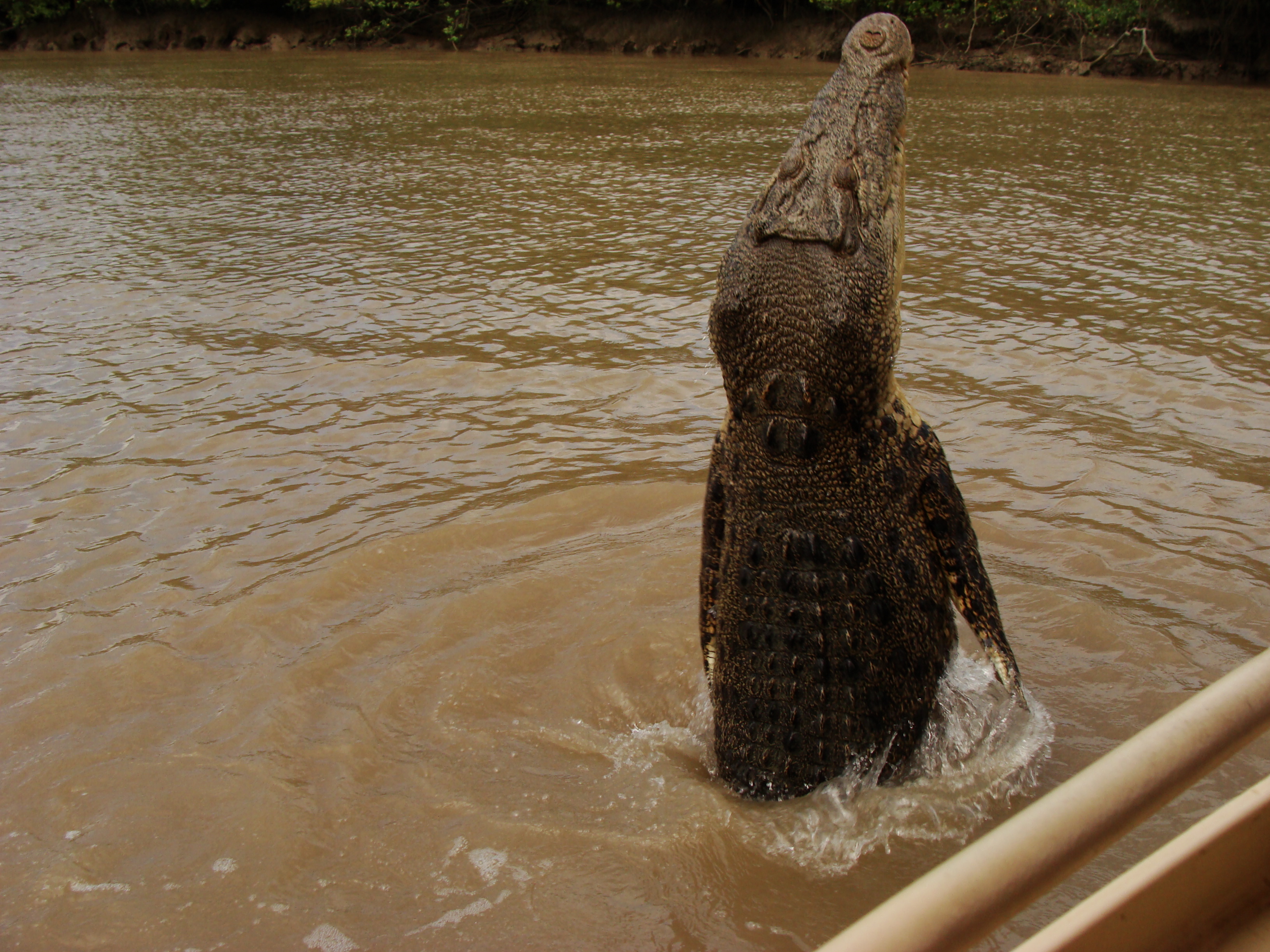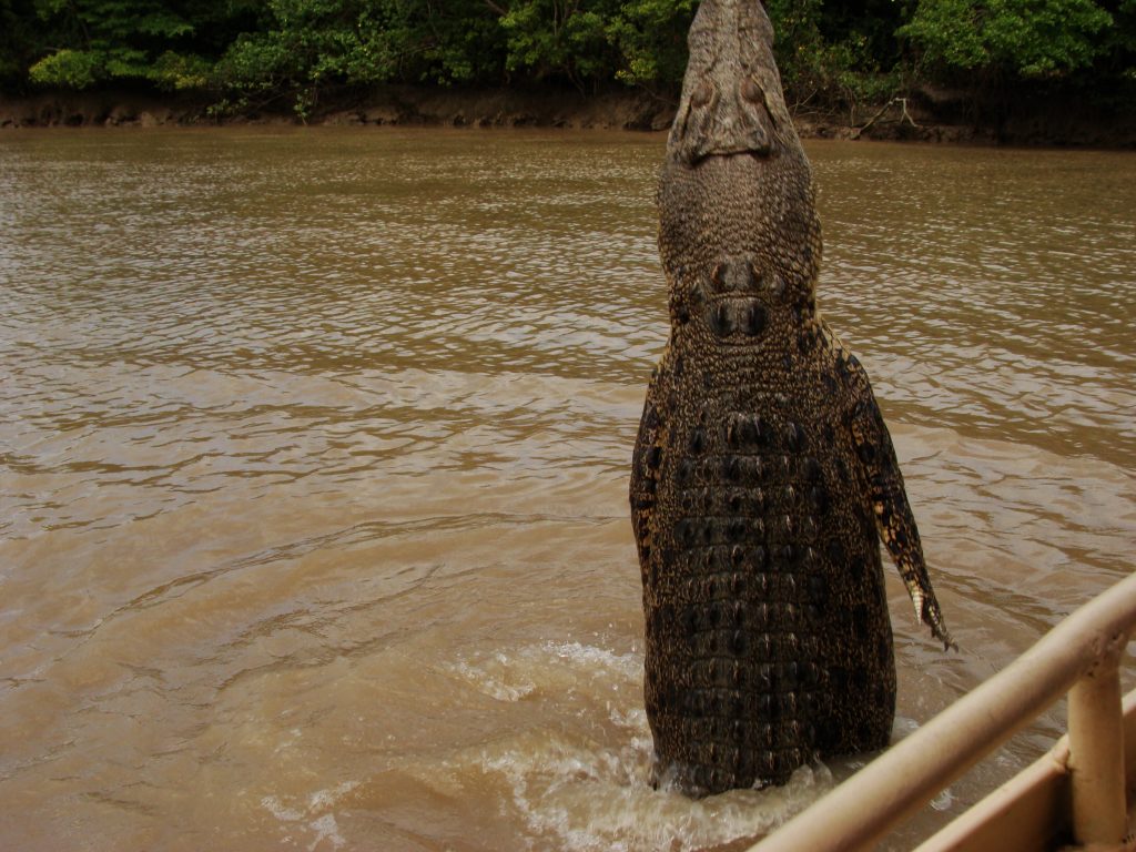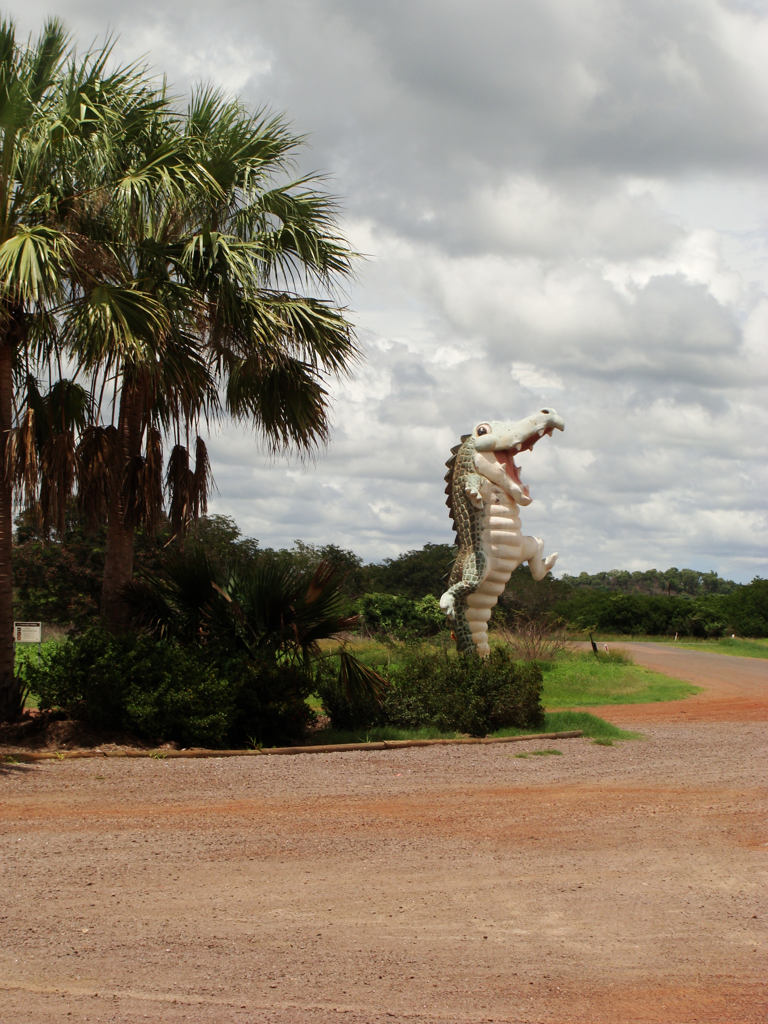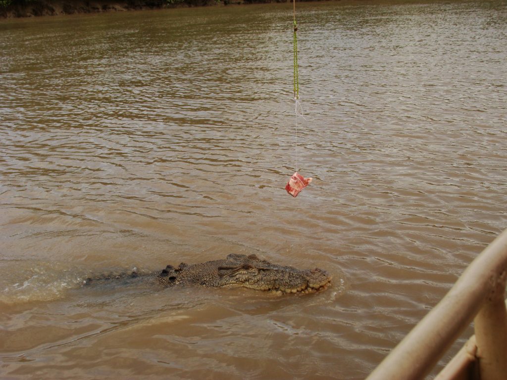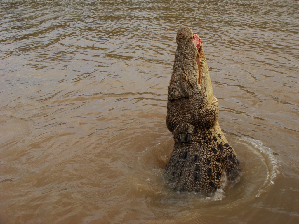 Der nächste Ort war dann Jurabi im Kakadu Nationalpark. Zunächst aber waren wir 74km auf Dirt Roads unterwegs um zum Waterfall Creek zu kommen, in deren Lagune Crocodile Dundee gedreht wurde. Leider regnete es dann am Ubirr, sodass wir den Sonnenuntergang da nicht mehr verfolgen konnten. Es regnete nun nämlich jede Nacht und die Gewitter kamen langsam rein. Es ist jetzt nämlich Wetseason und das heißt: Tagsüber Sonne und nachts Gewitter, obwohl die schon gegen ein Uhr aufzogen. Von Jurabi sind wir dann in den Litchfield Park gefahren und haben auf dem Weg noch bei den Jumping Crocs Station gemacht. Da werden wilde Salties gefüttert, die sich für das Essen schon bis zu 1m aus dem Wasser bewegen müssen.