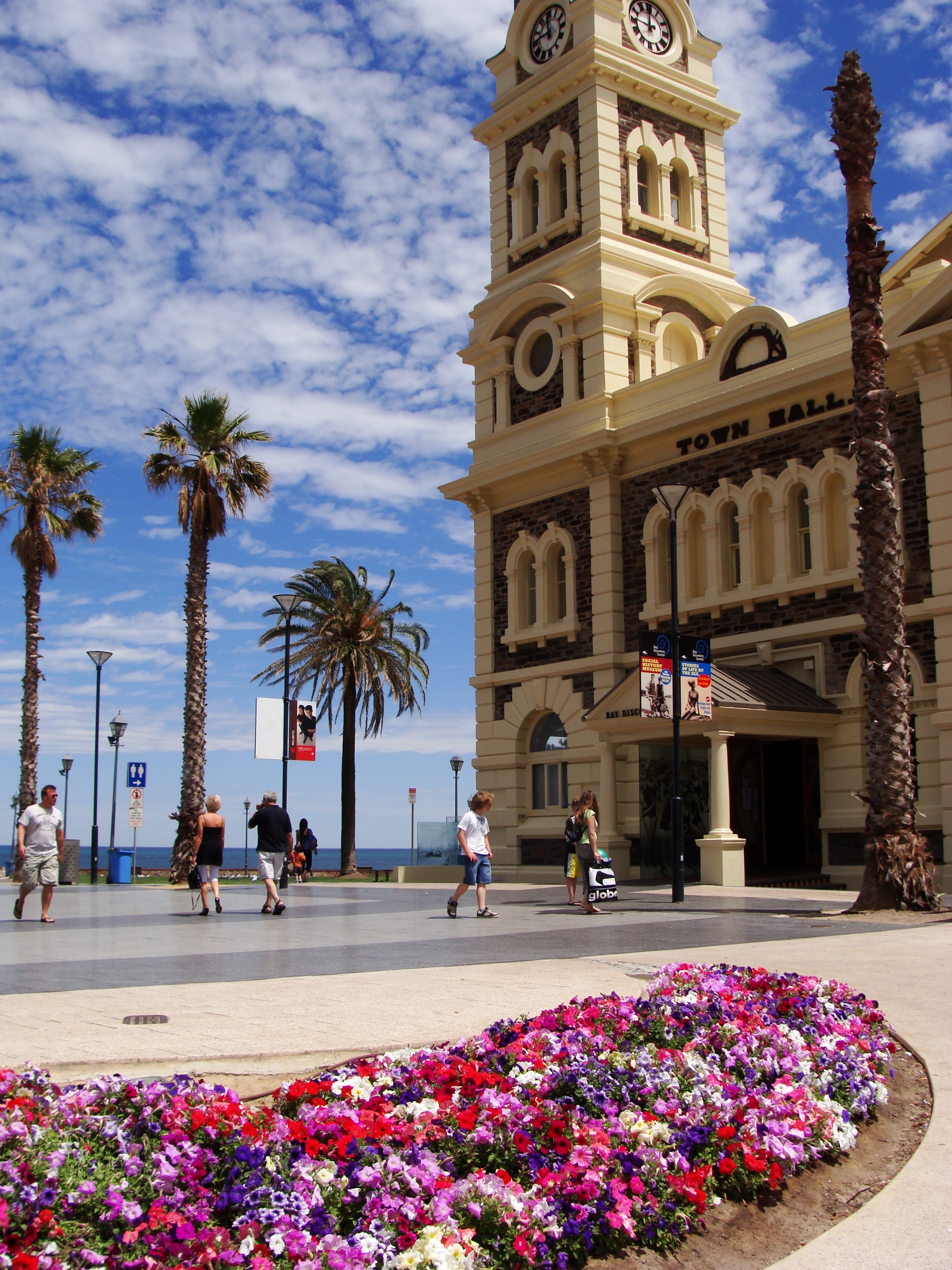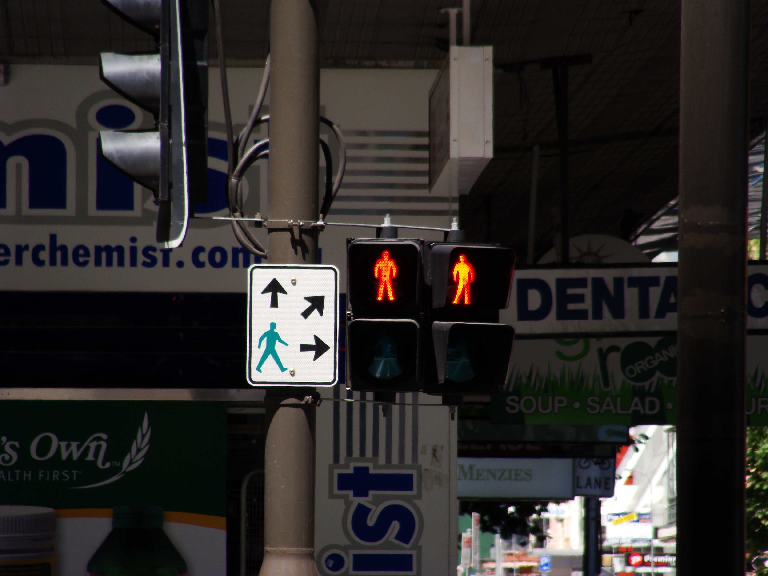 Na, die gibt es hier wenigstens auch…Bei grün darf man in alle Richtungen gehen, muss dafür aber auch ganz lange warten…Glenelg, Adelaide’s Stadtstrand. Die einzige Tramlinie fährt von der Innenstadt direkt an den Pier.
