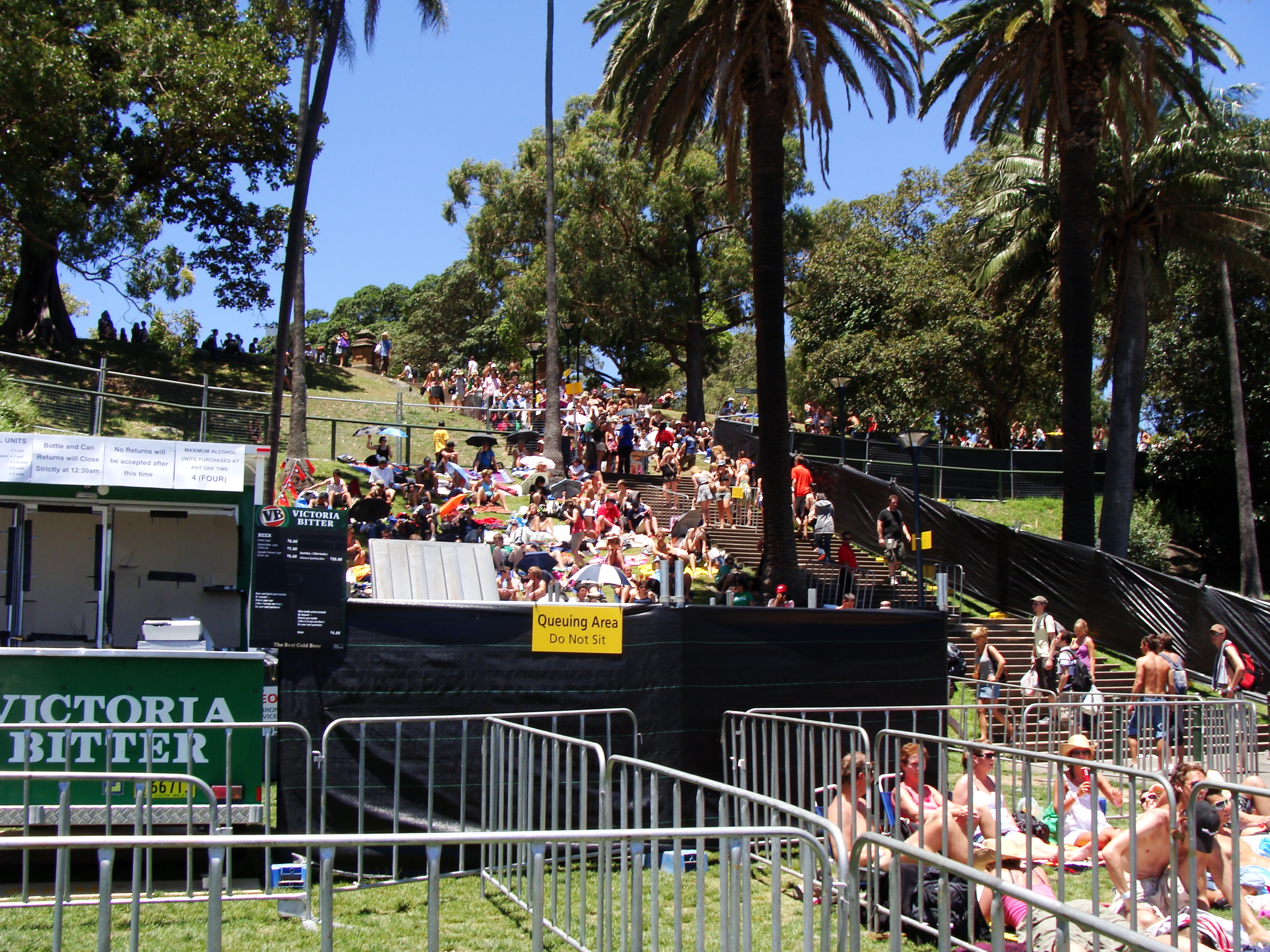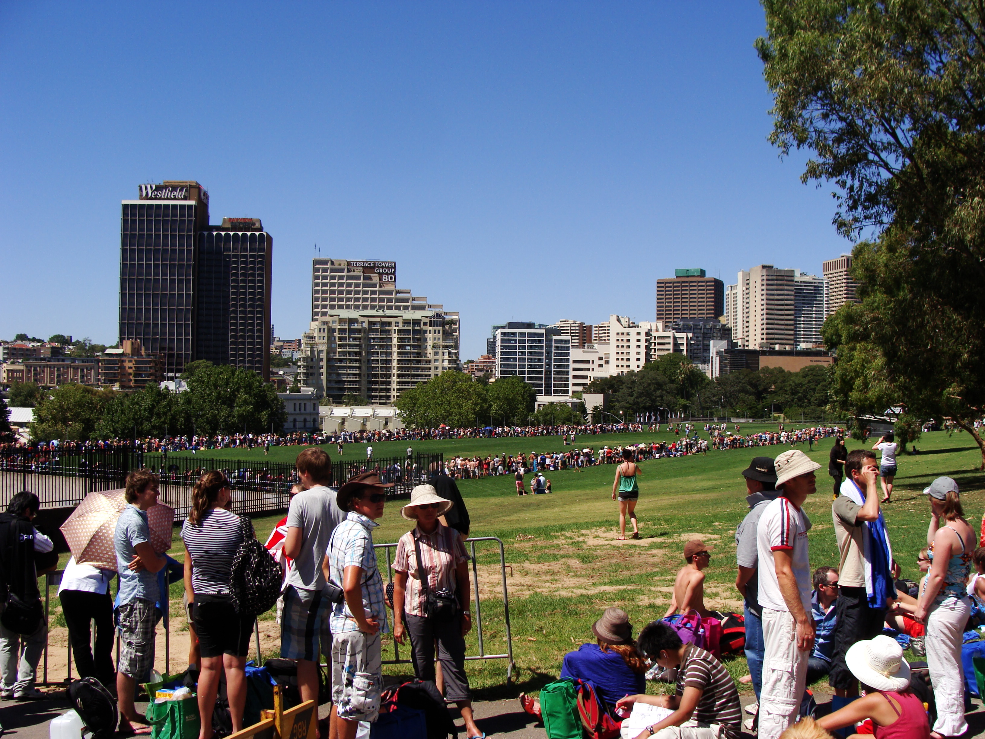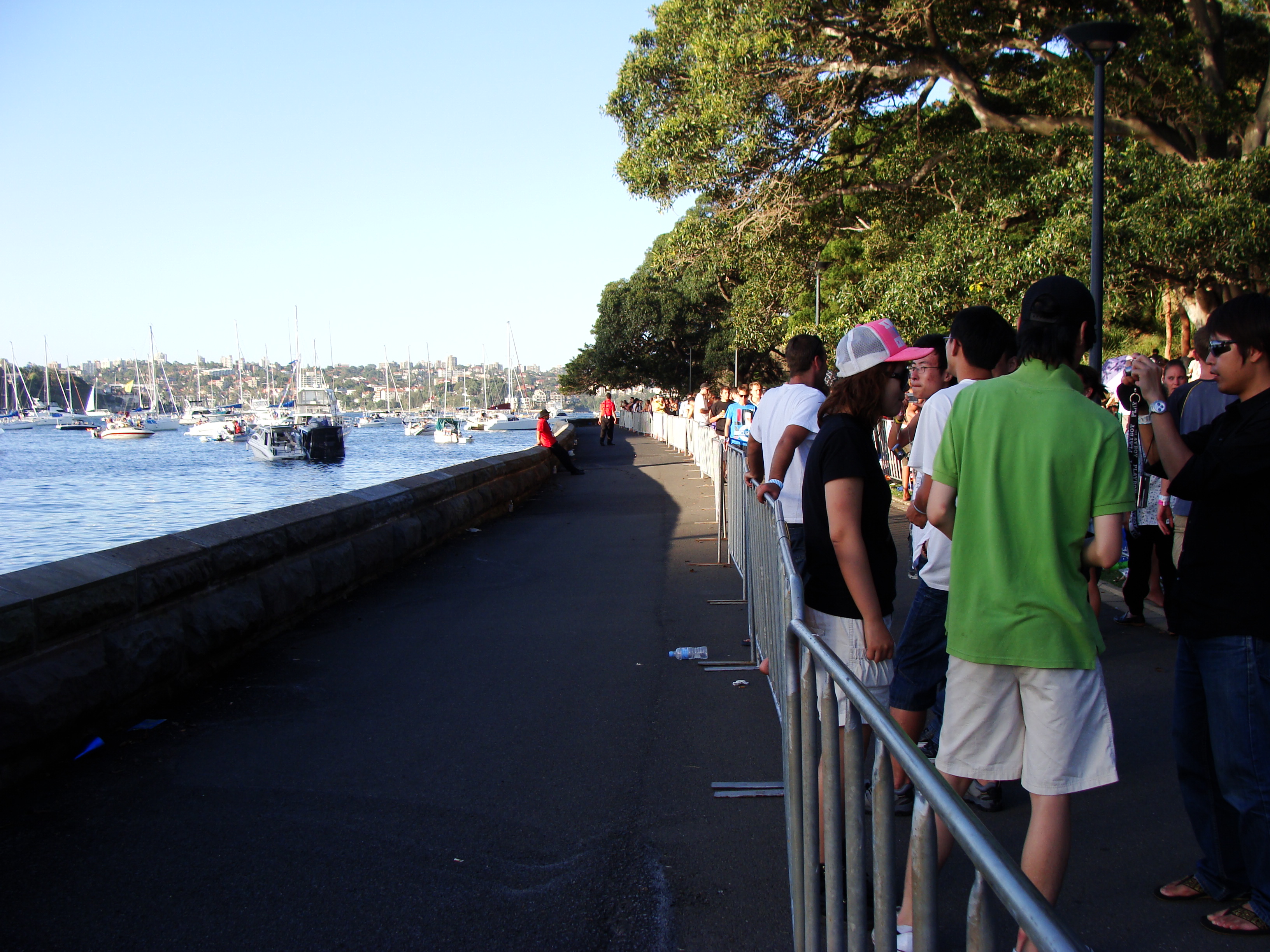 Auch die Fähren sind ein gutes Fortbewegungsmittel. Ich hatte mir eine Wochenkarte gekauft ($43) und hatte damit auch alle Fähren mit drin, was ich dann auch ausgenutzt habe. Unter der Brücke auf das Opernhaus zufahren ist schon toll. Die Hafenbrücke sieht man einfach von überall, das Opernhaus natürlich nicht, es ist kleiner. Aber der Blick von Mrs Macquarie’s Point aus ist schon einfach gigantisch und so entschied ich mich auch dafür, dort das Feuerwerk, mit dem das Jahr 2009 begrüßt werden sollte, zu schauen. Das Feuerwerk war der Hauptgrund, warum es zu dieser Zeit nach Sydney gehen sollte. Das Gelände war am Vortag abgesperrt worden und man musste sich einreihen. Wie zu erwarten war, campten einige die Nacht zuvor direkt vor dem Einlass. 20.000 Leute war das Limit und ich hatte das Gefühl, es war gut voll. Vielleicht waren 3.000 Leute vor mir in der Schlange, auf jeden Fall hatte ich keine Probleme, einen Platz in der ersten Reihe zu bekommen. Höher gelegene Plätze waren wohl noch beliebter und schneller vergriffen, aber ich will mich über meine Sicht mal nicht beschweren. Vier Stunden hatte ich angestanden und vor Ort musste ich dann auch noch einmal elf Stunden warten. Dank 32 Grad in der prallen Sonne fiel das Warten aber nicht sonderlich schwer. Zumal ich Gesellschaft aus meinem Zimmer und auch von ein paar Deutschen hatte. Die kannten sich untereinander auch, die Deutschen hatten vor mir in der Schlange gestanden… Nach dem Feuerwerk, von dem es auch nur ein Video und keine Fotos gibt, ging es dann auch zurück ins Hostel. Das Feuerwerk war einfach mal der Hammer, zwölf Minuten.
