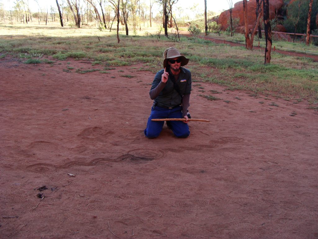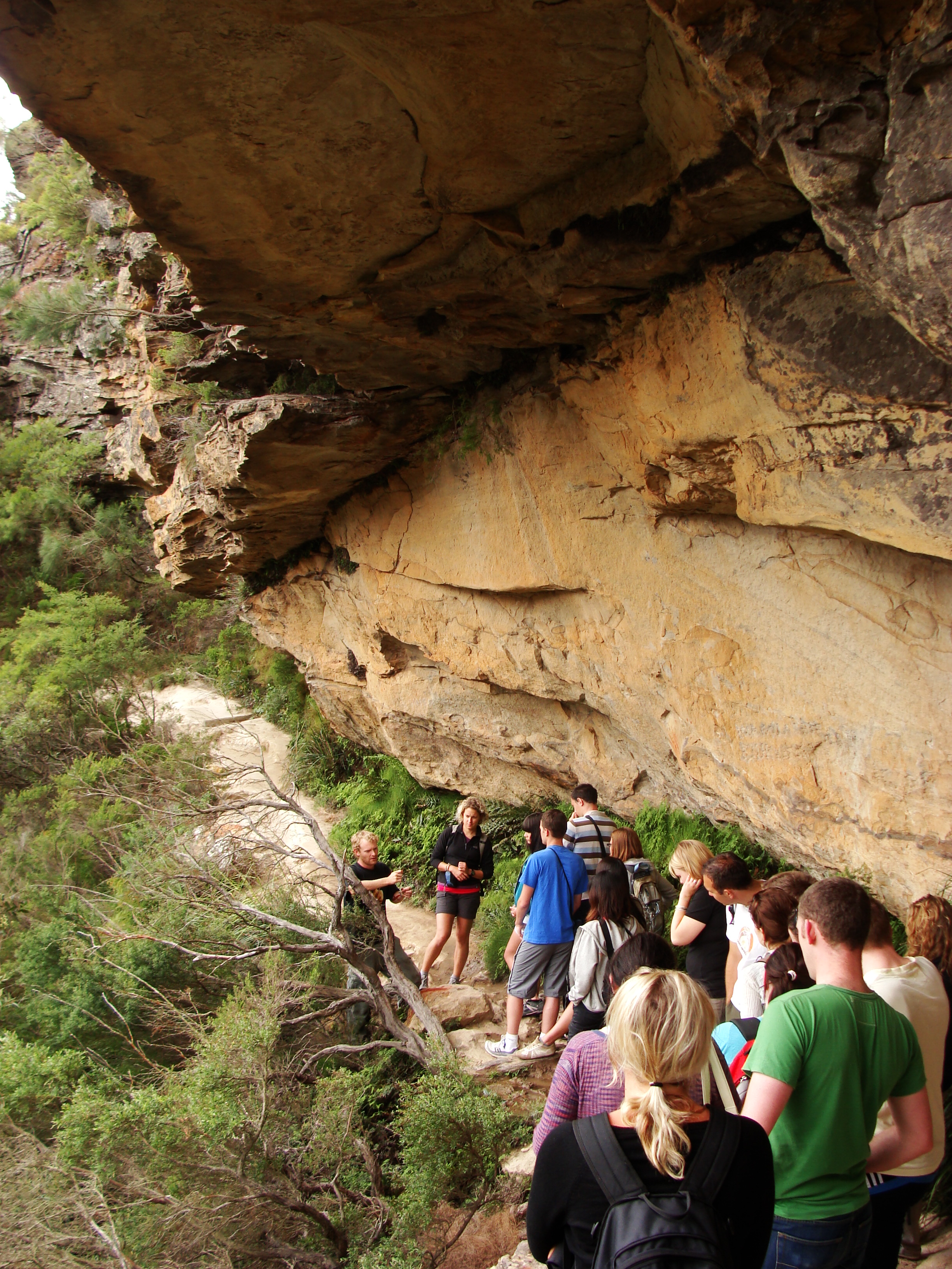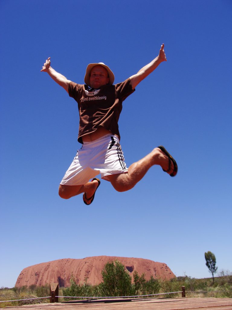 Zu mittag gab es Sandwiches, mit vielen frischen Zutaten. Das sollte es dann auch die anderen vier Tage geben… Anschließend ging’s dann zum Fels und so rot ist der gar nicht. Raufklettern durfte man auch nicht, zu heiß und außerdem ist das nicht im Einklang mit den Aborigines, für die die Besteigung des Felsens Teil einer Zeremonie ist. Also sind wir von Höhle zu Höhle gelaufen und haben ein paar Geschichten über die Sichtweise der Ureinwohner gehört.