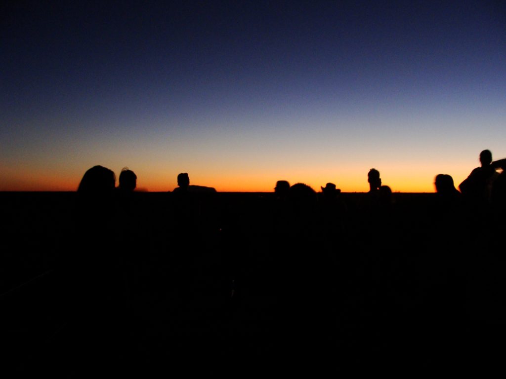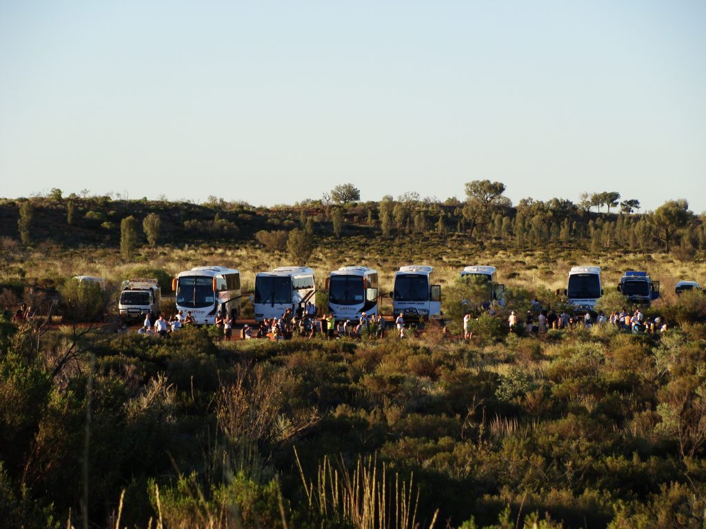 Bin dann noch mit zwei Franzosen halb um den Fels herum gelaufen, keiner wollte ganz rum und alleine wollte ich auch nicht. Anschließend wurde dann der Sonnenuntergang betrachtet. Wie alle Touren, ist das natürlich ein Muss und so war die Uluru Sunset Viewing Area für die Busse auch schon gut gefüllt, als wir mit Snooty (Name des Busses) da ankamen. Da wurden Buffets aufgebaut…