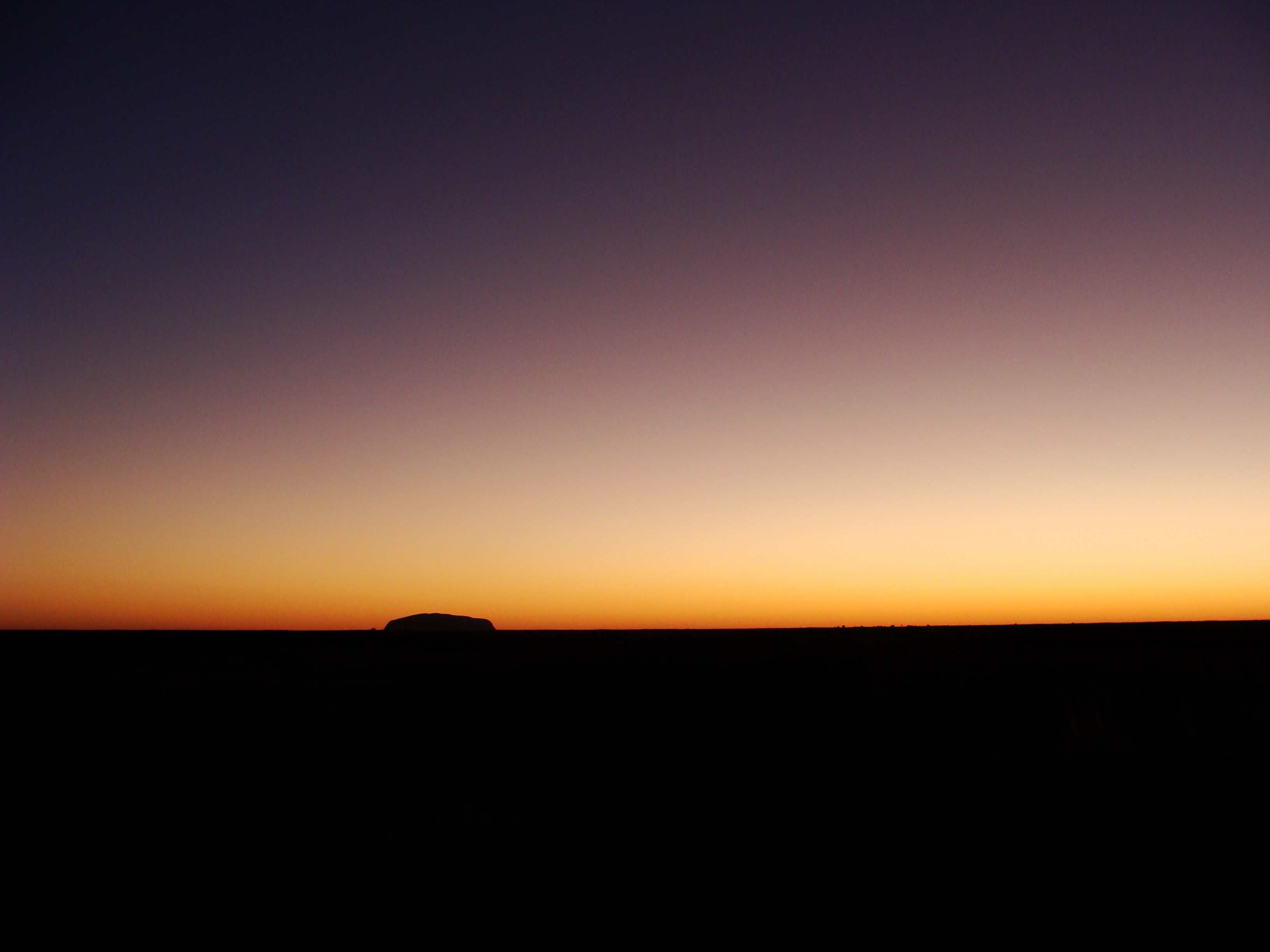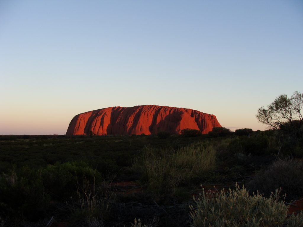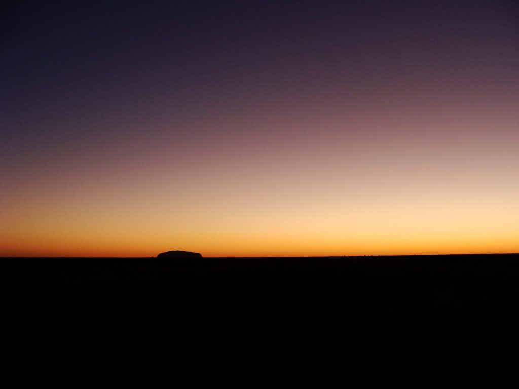 Das ist Mt Connor und ist ein verdorbener Berg (lt Aborigines). Viele Touristen fallen drauf rein und denken, sie hätten Uluru schon gesehen… Man muss schon sagen, der erste Blick auf den roten Felsen ist schon ein magischer Moment. Zwischen Sanddünen hindurch kommt auf einmal am Horizont ein grau-rotes Etwas zum Vorschein. Dann geht es noch unzählige Kilometer weiter auf dem Highway, immer mit Blick auf Uluru. Von der Sunset Viewing Area gab’s dann die ersten Fotos: