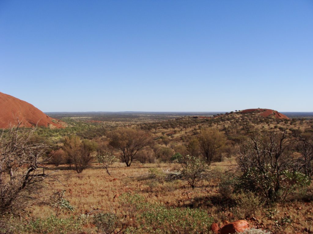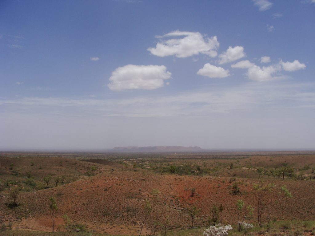 Viereinhalb Stunden waren wir für die knapp 8km unterwegs. Aber Fotos machen und über Felsen klettern kostet halt seine Zeit. Warm war es auch einigermaßen, aber nicht heiß, dank den Wolken. Der letzte Tag brachte dann auch zum ersten Mal bewölkten Himmel mit sich und Regenwolken zogen auf. Lunch gab es beim Gosse Bluff View, einem Meteoriten-Krater. Leider nicht so gut sichtbar, eher noch ein Fooluru: