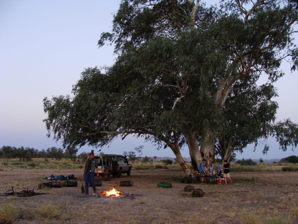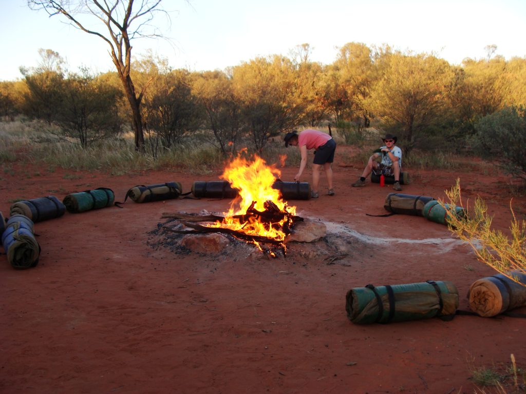 Weiter ging’s auf dem Highway, bis der Tourguide auf einmal abbremste und nach links ins Outback abfuhr. Weiter ging es über „Felder“, die von Pferden und Rindern, und halt auch von wilden Kamelen bevölkert sind. Es wurde Feuerholz gesammelt und dann ging es mit ein wenig Off-road-Feeling den alten Uluru-Highway entlang. Bis zur Kings Creek Station, dem nächsten Overnight campground ging es dann aber wieder auf geteertem Highway entlang… Da wurde dann wieder in den Swimming Pool gesprungen und das Abendessen vorbereitet. Ein anderer Bus war da auch noch, aber da wir richtig Outback-Feeling gebucht hatten, ging es noch fünf Kilometer Dirtroad am Flugfeld für die Royal Flying Doctors entlang zu einem kleinen Schuppen. Witzigerweise gab es aber ne Dusche und ne Toilette mit Spülung. (Die ersten paar Kilometer Wasser sind dann halt auch relativ warm :)). Lagerfeuer wurde entzündet und Swags als Sitze positioniert: