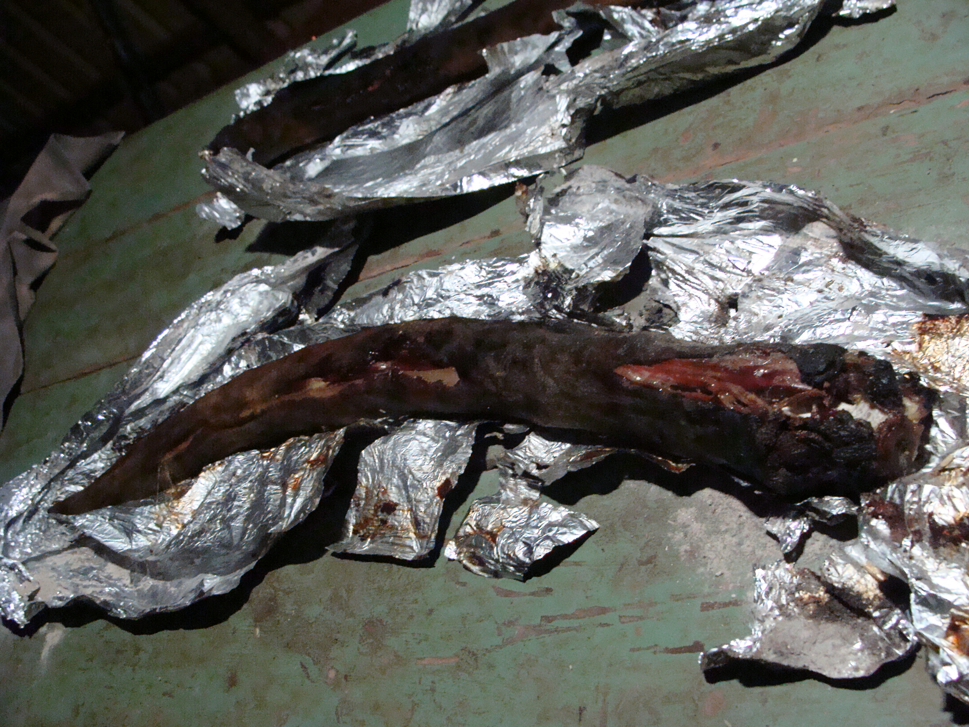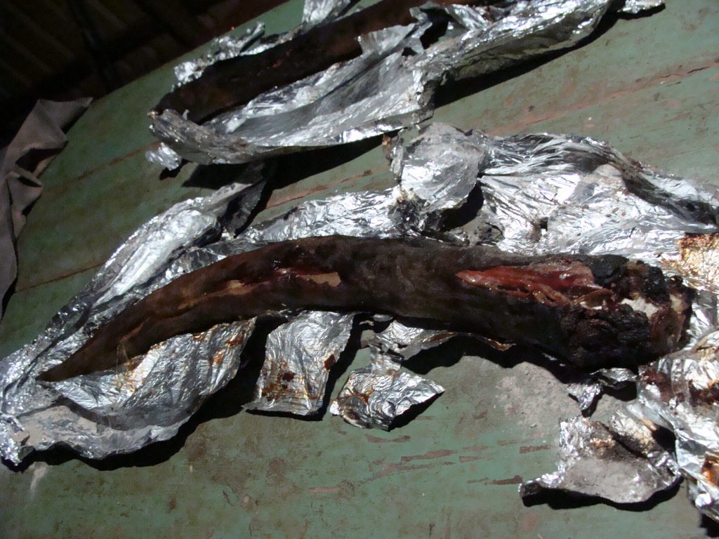 Heute gab es Hühnchen mit ganz viel Gemüse vom BBQ. Als Highlight gab es dann heute Känguruh-Schwanz. Der war die letzten Wochen immer ausverkauft gewesen, wir bekamen aber welche :). Ein wenig geekelt hat man sich schon, aber geschmeckt hat der wirklich gut. War allerdings fettig, da die Roos den Schwanz als Schwungkörper beim Springen benutzen. Dafür gibt es Minuspunkte. Zubereite wurde er, indem die Haut und Haare im Feuer verbrannt und abgeschabt wurden und anschließend wurde er in Alufolie eingewickelt und etwa eine Stunde in die Glut gelegt. Das Fleisch schmeckte dann wie ein Mix aus Wild und Lamm, ohne Fett durchaus delicious: