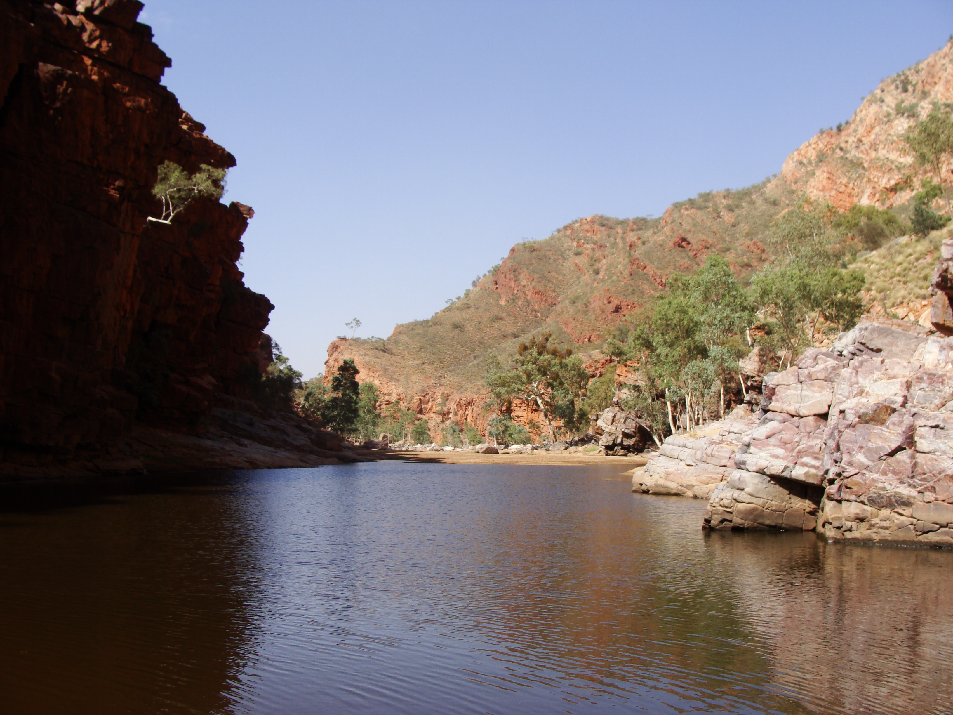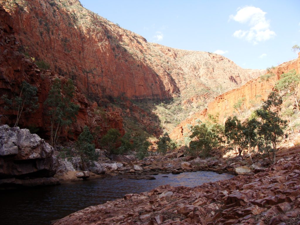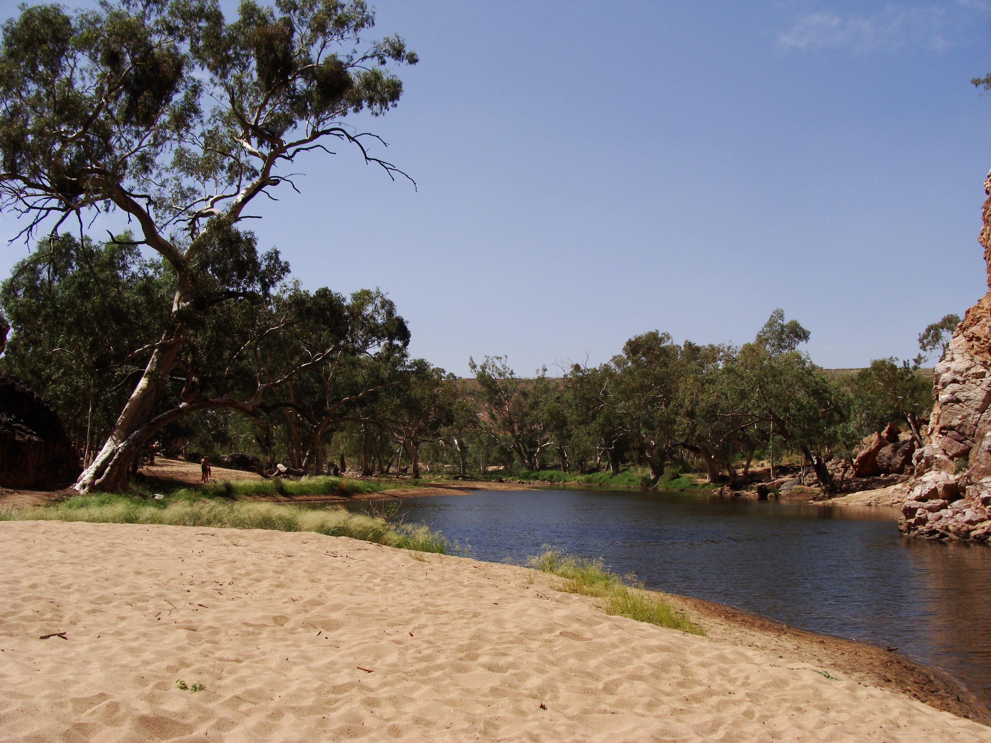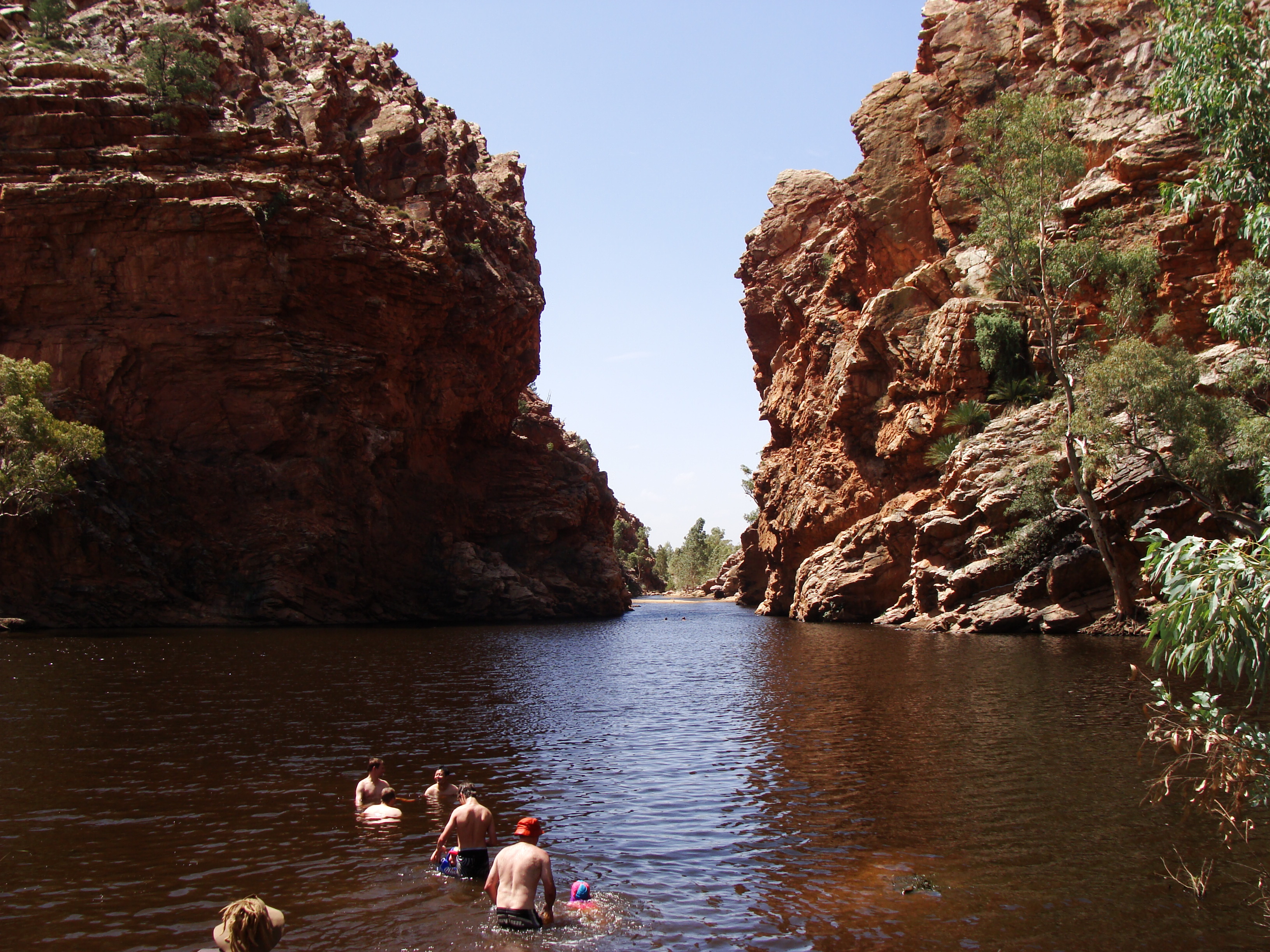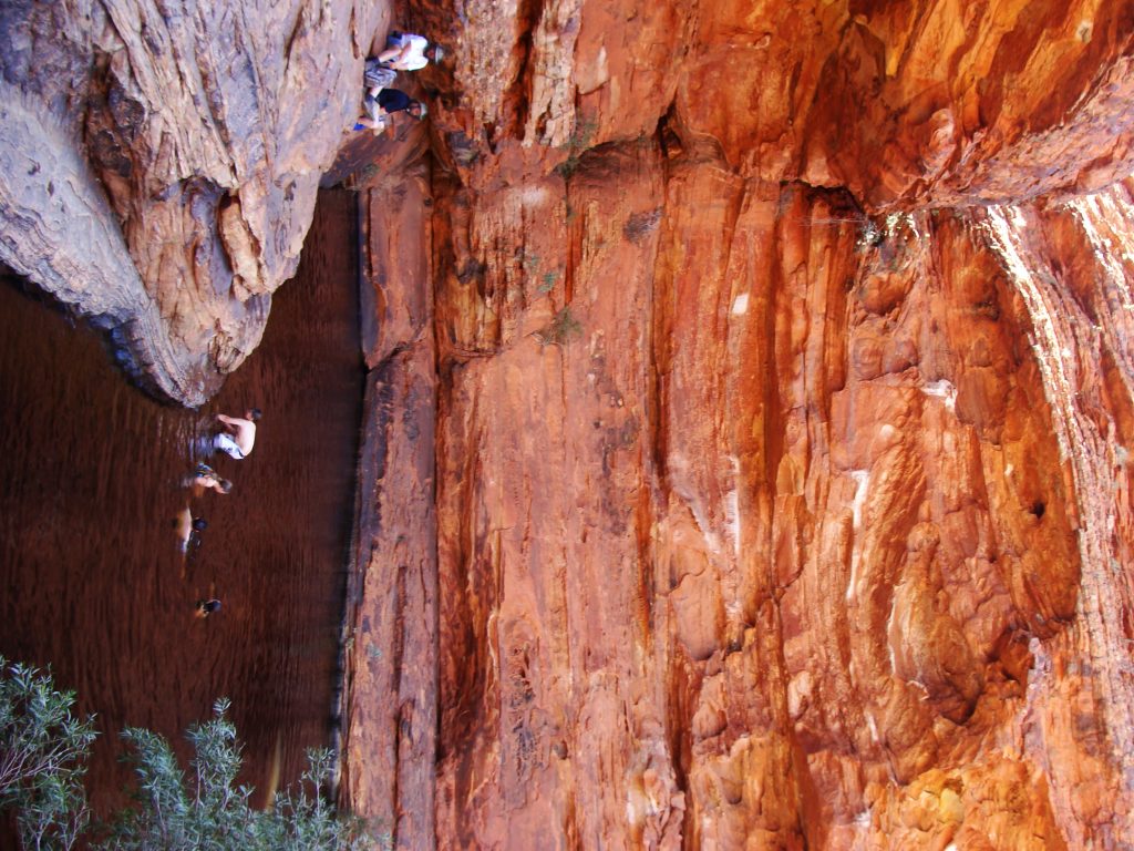 Wir fuhren dann von Alice gen Westen, in die Western MacDonnell Ranges. Da gab es ein paar Waterholes zum Schwimmen, hier das größte permanente in Central Australia (Name vergessen).