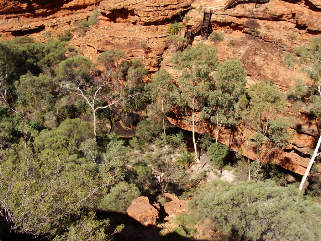 Am dritten Morgen ging es natürlich auch wieder früh hoch, aber ein wenig später. Nächster Walk war King’s Canyon. Begonnen ebenerdig mussten erstmal ein paar Treppenstufen erklommen werden um oben auf den Klippen herum zu wandern: