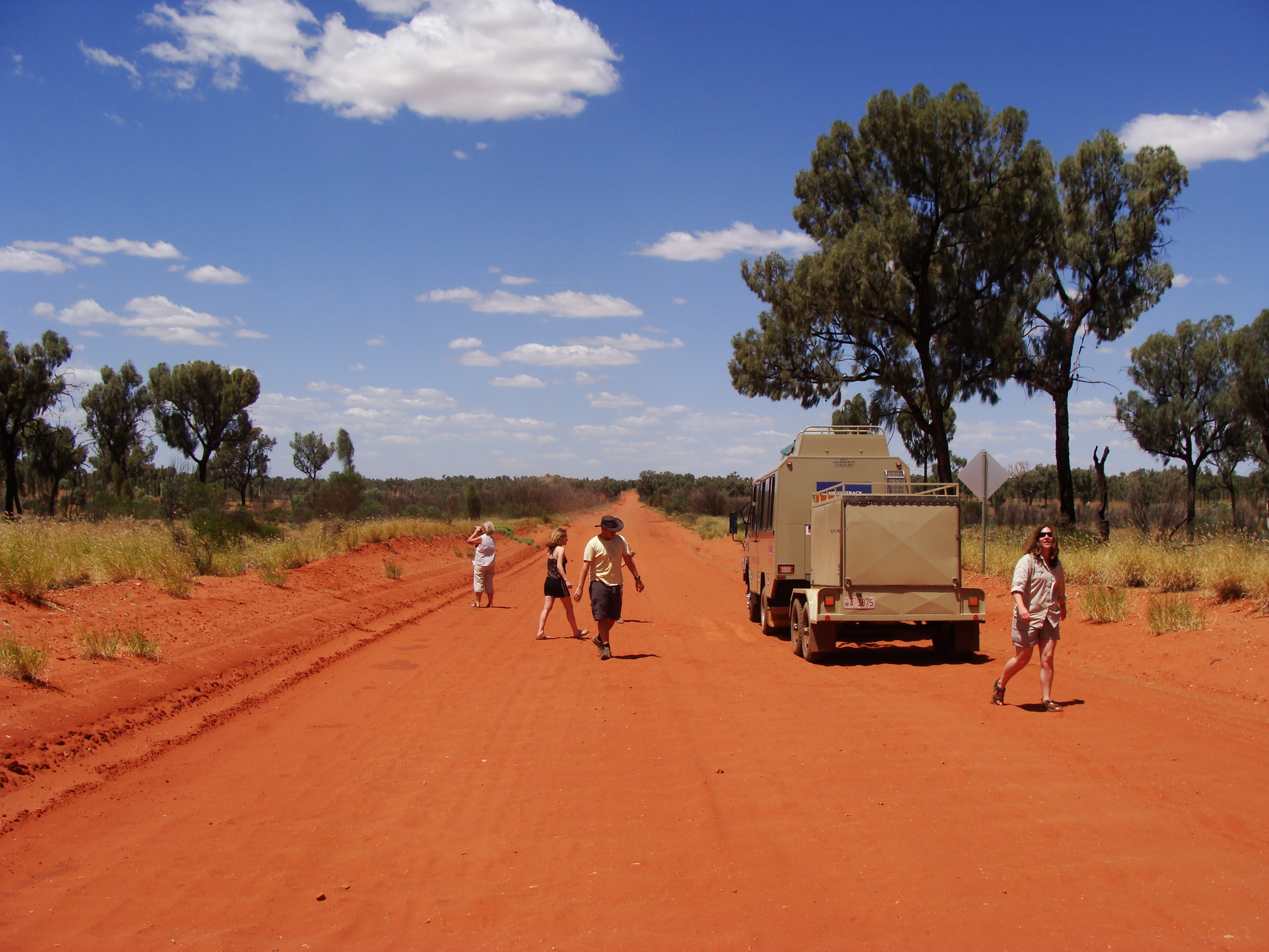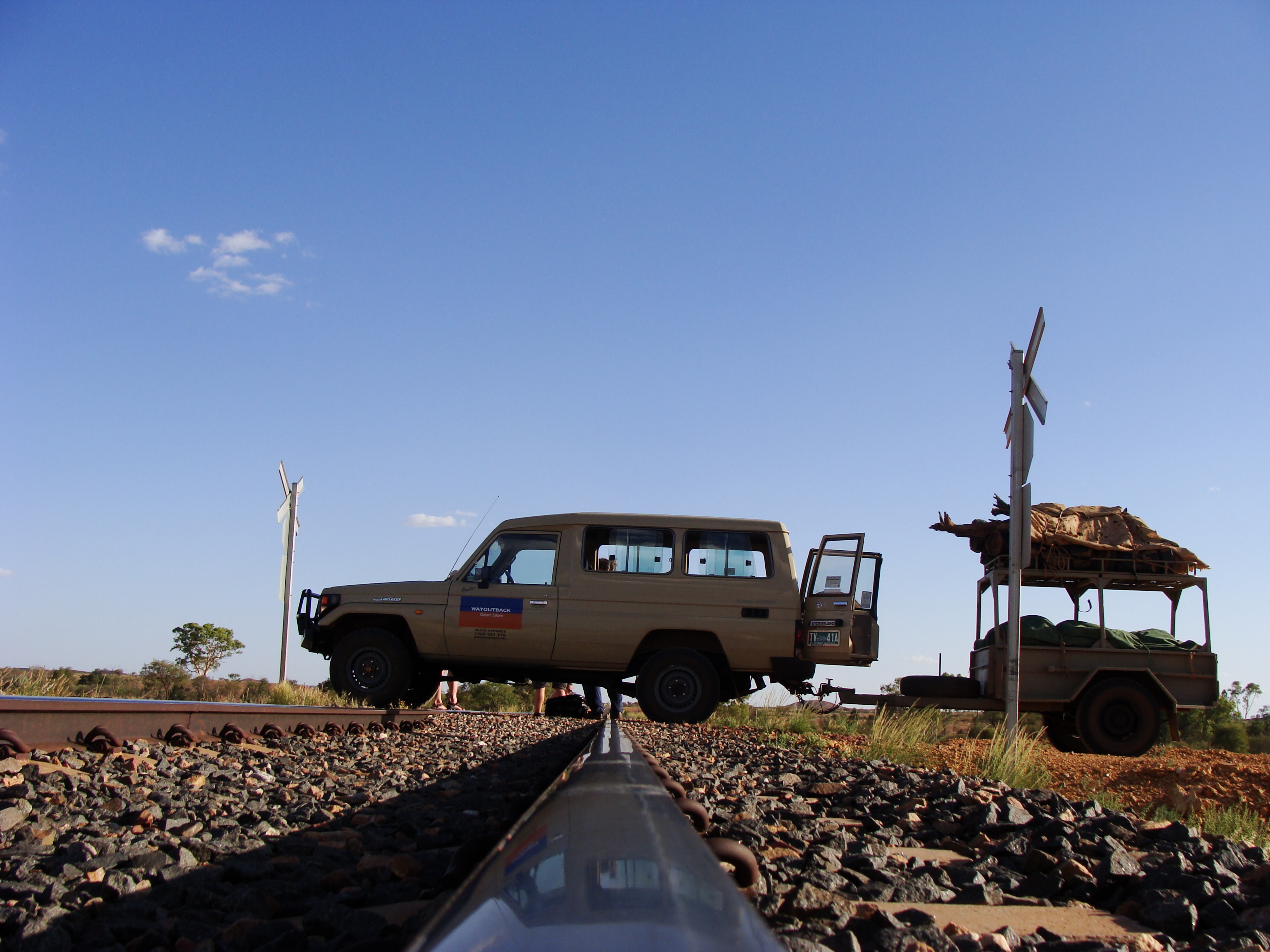 Zurück auf dem Stuart Highway wurde mit dem Landcruiser getroffen, der die fünf-Tages-Tourler bewegen sollte. Die drei-Tages-Tourler fuhren mit dem großen Truck wieder zurück nach Alice Springs. Da wechselt man das Auto und hat gleich eine Panne, mitten auf der einzigen Zugstrecke im Umkreis von tausenden Kilometern: