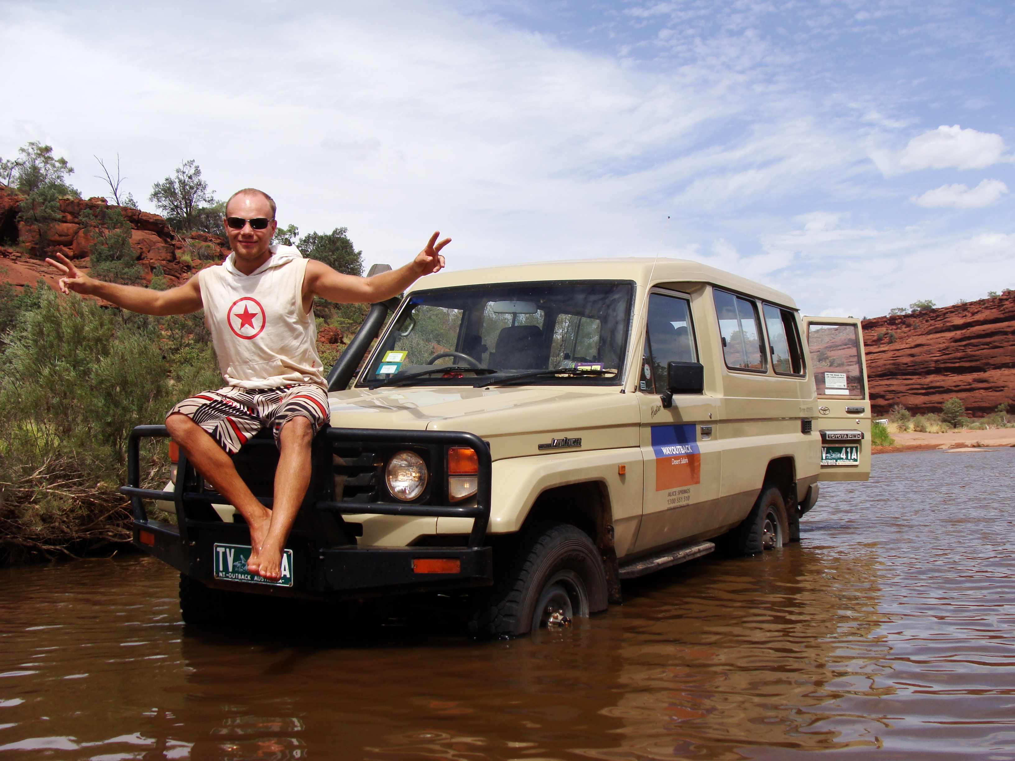Und das war dann auch das letzte Highlight auf der Reise. Vom Allrad-Fahren gibt es nur lange und schwere Videos… Es ging dann den geteerten Highway zurück und beim Hostel abgeliefert und natürlich erstmal geduscht. Abends ging es dann noch ins Bojangles, dem einzigen Pub wohl in Alice. Da wurde es nach zehn Uhr richtig voll… Meine Gruppe war schnell verschwunden, aber ich traf noch den Stuttgarter, neben dem ich im Zug von Adelaide nach Alice gefahren war… Und später noch zwei Mädels von meiner Great Ocean Road Tour. Gegen halb zwei ging’s dann zu Fuß zurück ins Hostel (Entgegen aller Warnungen und Empfehlungen). Am nächsten Morgen war dann draußen alles nass! Es hatte über Nacht ordentlich geregnet und der Himmel war ausnahmslos bewölkt. Gut, dass die Tour vorüber ist :). Zum Flughafen und mit Qantas nach Melbourne geflogen. Da ins Hostel eingecheckt und alles restliche Gepäck von Faizan abgeholt.