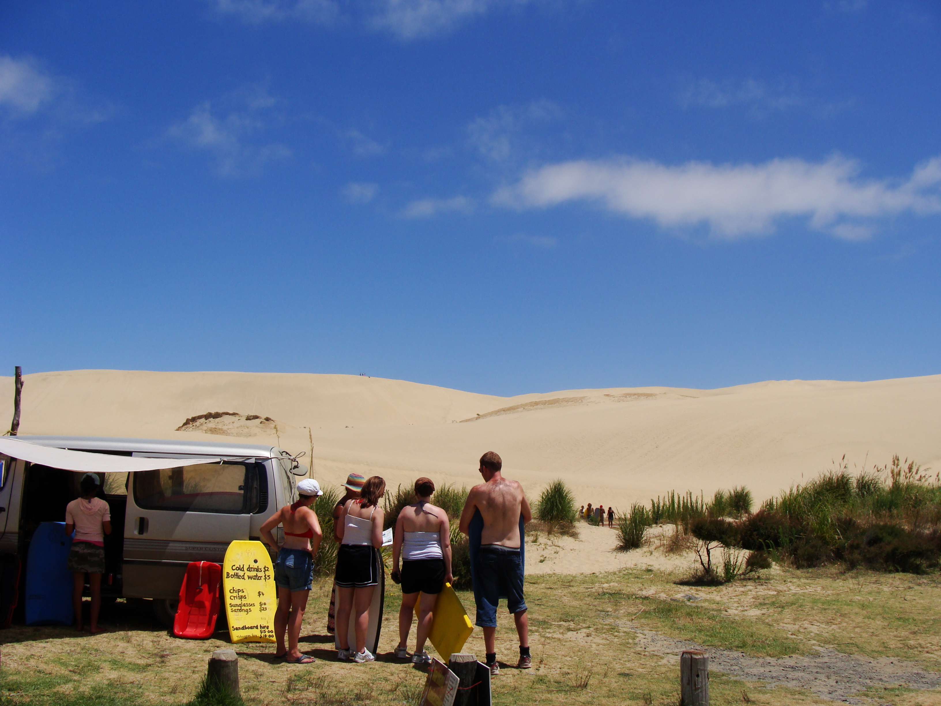 Vorher war ich noch ein wenig Sandboarden, was mich aber nicht wirklich vom Hocker gerissen hat, durfte man doch nicht aufstehen… Hinten die hintere Düne ging es runter.