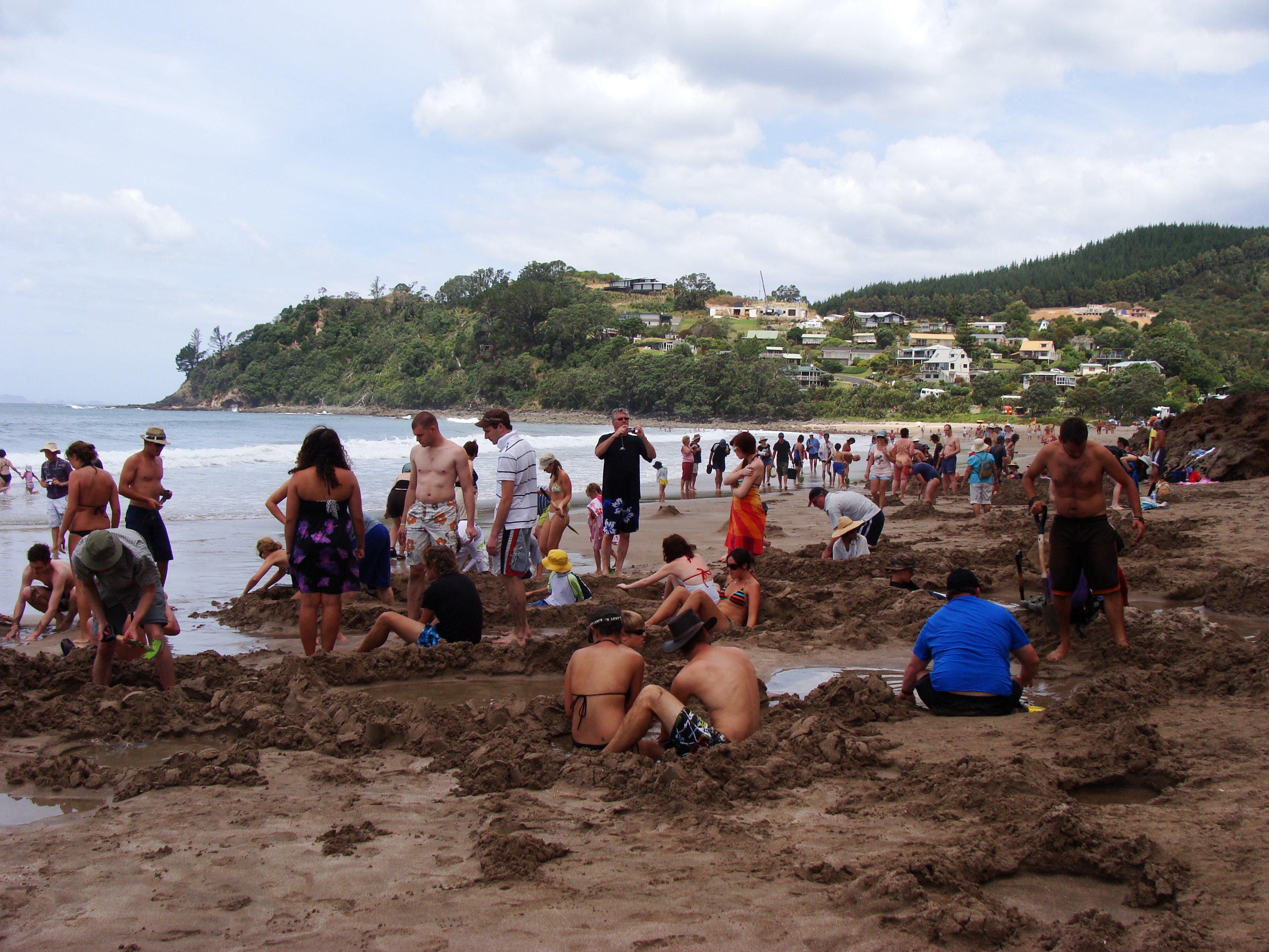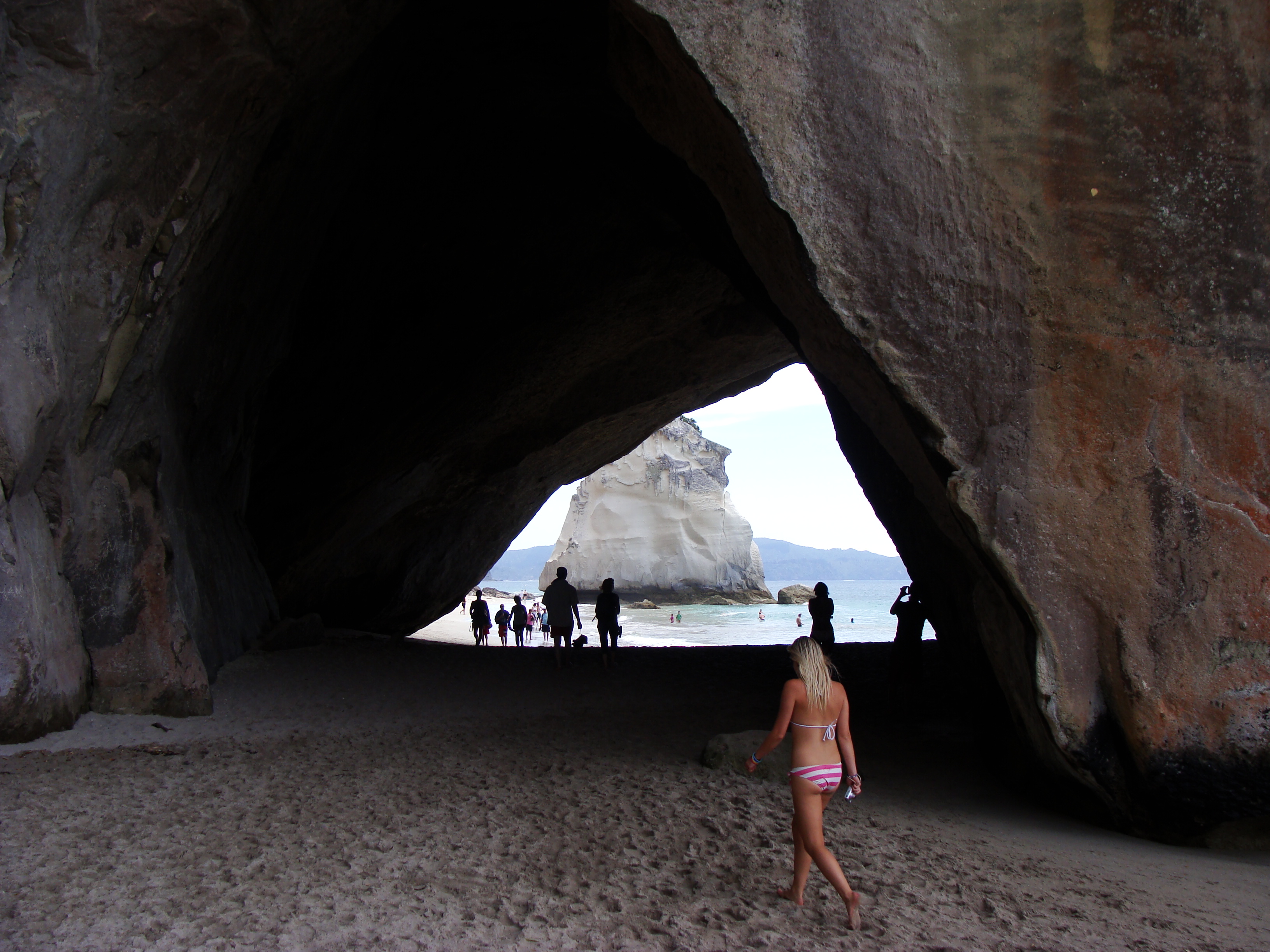 Am vierten Tag ging es rund um die Coromandel Peninsula, über die Route 309 und noch zum Hot Water Beach, sowie Cathedral Cove. Beim Hot Water Beach wird von Lava erhitztes Wasser rausgespült, sodass man sich bei Niedrigwasser einen eigenen Whirpool bauen kann. Das Wasser war aber so heiß (65°C), dass ich mir gleich die Füße verbrannt habe und in den kalten Ozean fliehen musste…